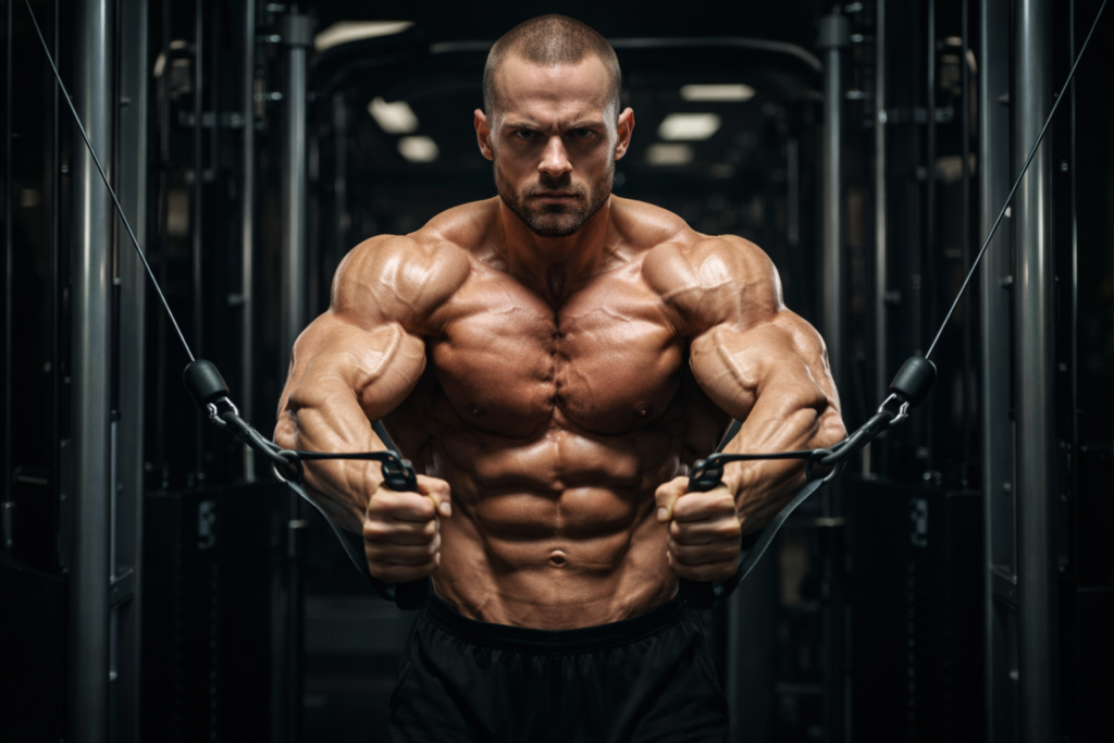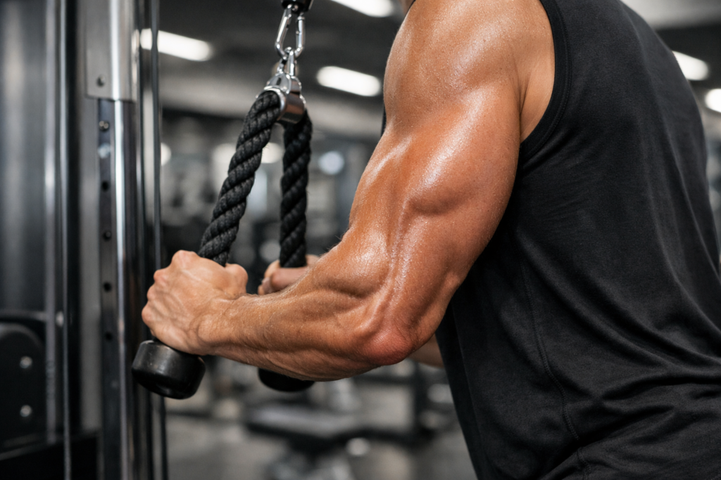 1. Tríceps Pulley com Corda: Um dos exercícios mais eficazes para isolar as três cabeças do tríceps. A corda permite uma “abertura” no final do movimento, aumentando a contração muscular.