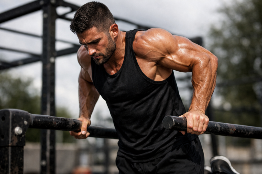 3. Mergulho em Paralelas: Um exercício composto poderoso que utiliza o peso do corpo. Além de trabalhar o tríceps de forma exaustiva, também recruta a parte inferior do peito e os ombros.